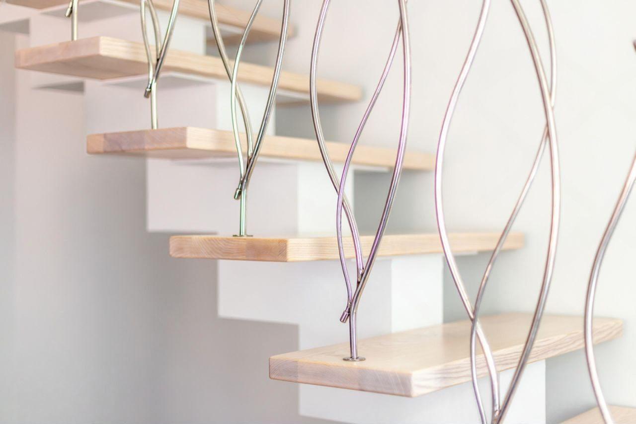 Основа композиции — белоснежный бетонный монокосоур, который служит невидимой несущей осью и словно растворяется в пространстве. На нем, будто паря в воздухе, расположены ступени из натурального бука, которые привносят в интерьер тепло и природную текстуру. Особый шарм конструкции придает комбинированное ограждение: тактильно приятный деревянный поручень плавно переходит в лаконичные металлические основания, а тонкие фигурные стержни балясин с хромовым покрытием ловят блики света, добавляя динамики.