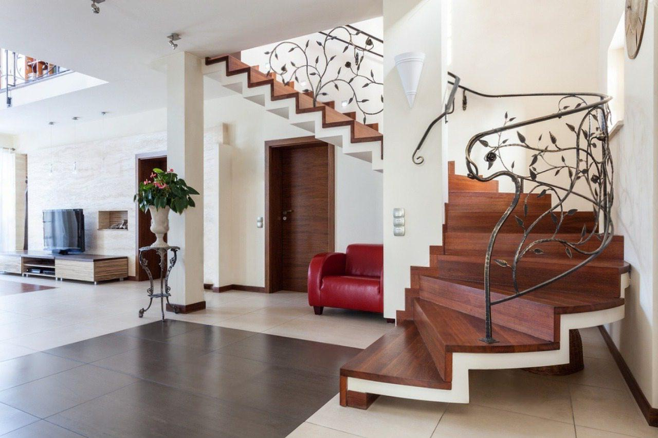 Эстетическая привлекательность. Лестница с поворотом с площадкой становится ярким акцентом интерьера: изысканная форма и отделка ценными породами дерева притягивают взгляды и подчеркивают статус домовладельца.